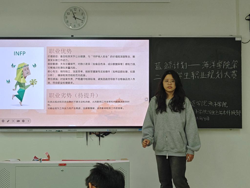 大赛现场,参赛选手紧扣“探索蓝色梦想,规划未来航程”主题,立足个人兴趣与专业特长,结合食品与海洋领域发展需求,进行了系统而全面的职业规划展示。选手们从自我认知、环境分析、职业目标定位、实施路径设计到动态评估调整,多维度阐述了个人职业愿景与发展路径。清晰的逻辑结构、饱满的展示热情以及对未来职业的深入思考,充分展现了77779193永利学子扎实的专业功底与积极向上的精神风貌。